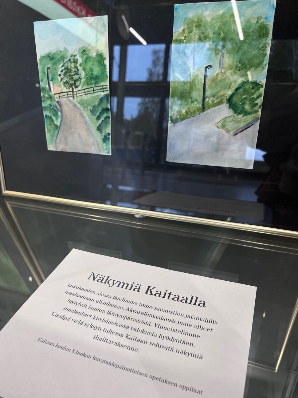 Yhteisöllinen näyttelyvitriini Kaitaalla on tarkoitettu asemaympäristötoimijoiden, kuten koulujen, päiväkotien ja harrastusporukoiden näyttelytilaksi. Lisätietoja yhteisöllisestä näyttelyvitriinistä Länsimetron sivuilla.